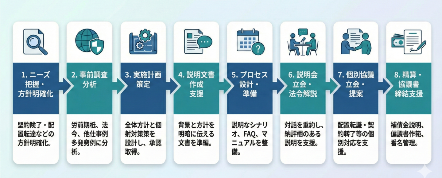契約終了、配置転換、移籍などの選択肢を整理し、従業員との合意形成を前提とした実行プロセスを設計します。
